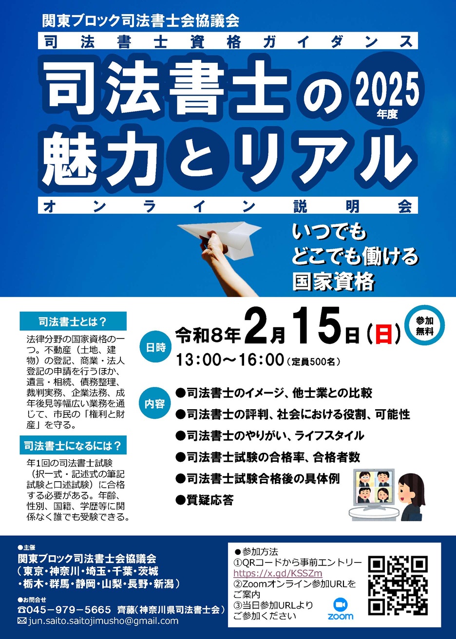 新潟県司法書士会を含む関東ブロック圏内の司法書士会で構成されている関東ブロック司法書士会協議会では、「2025年度司法書士資格ガイダンス」を開催いたします。
